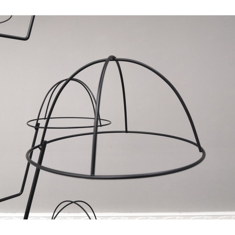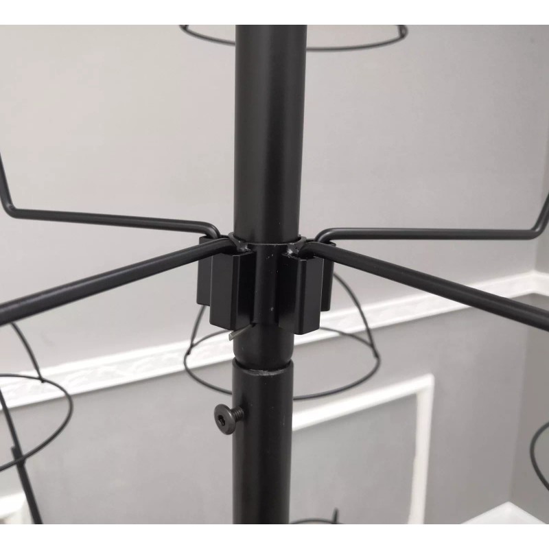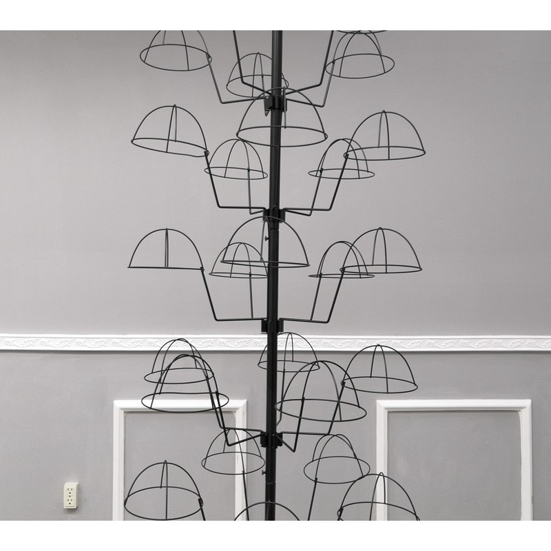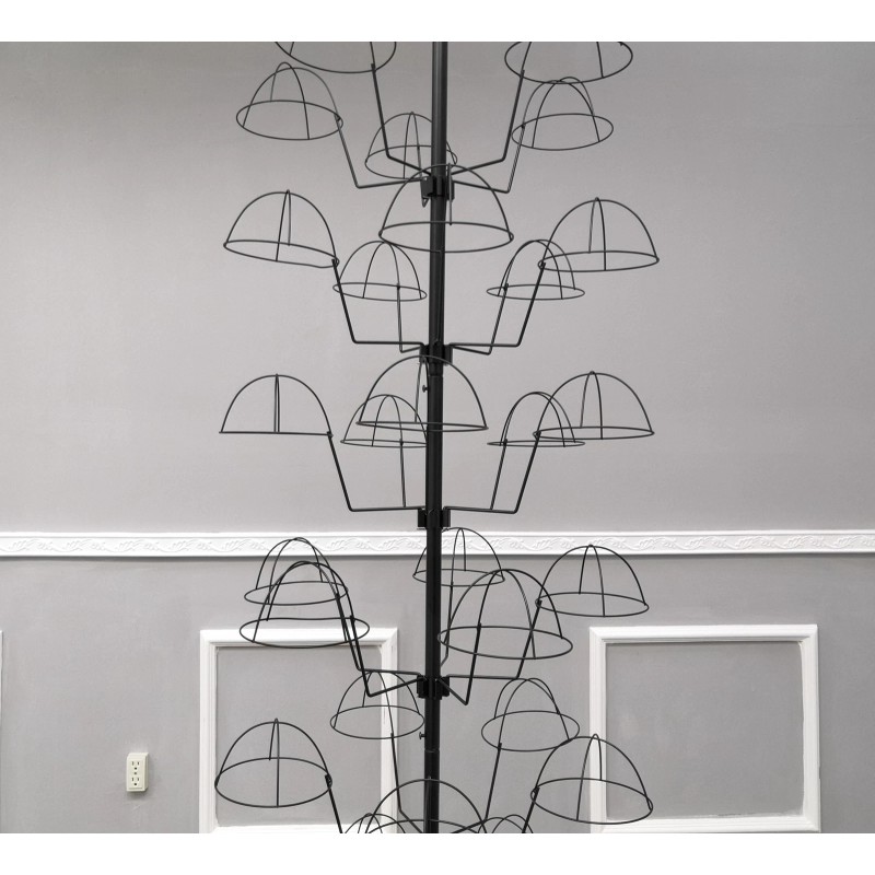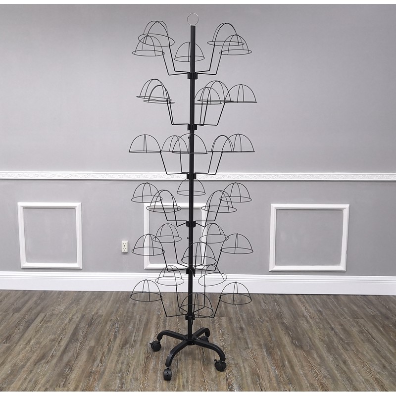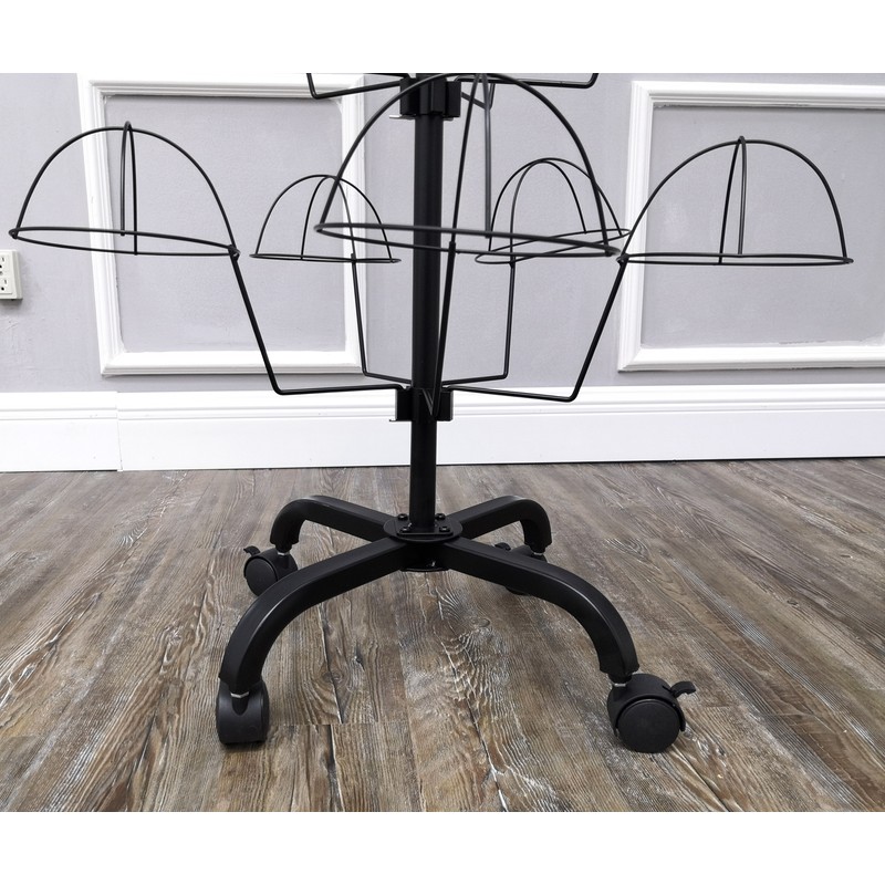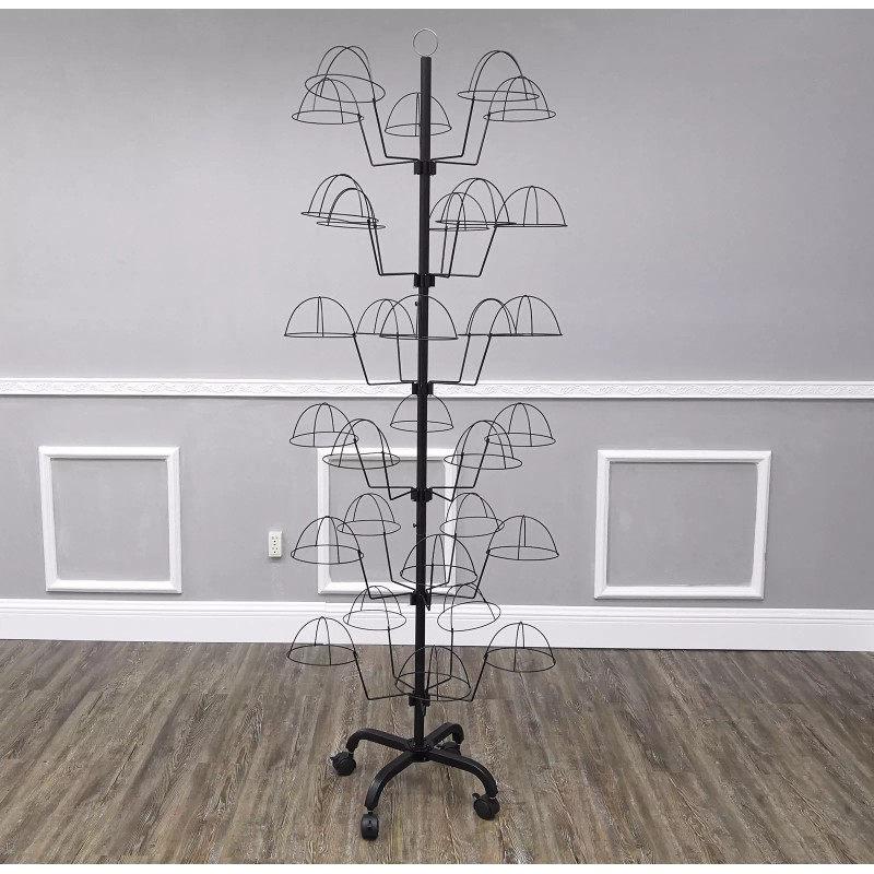 ( Steel Construction ) This display rack is made out of steel wire with black powder coated finish and rests on a black metal base. Sturdy and durable! Independent tier level rotating design, provides you or customers with optimal ease and pleasure to store, organize and browse your headwear. The hat rack handily displays 30 hats, wigs, or hand knit beanies.