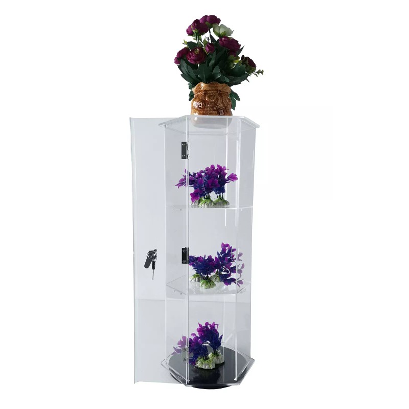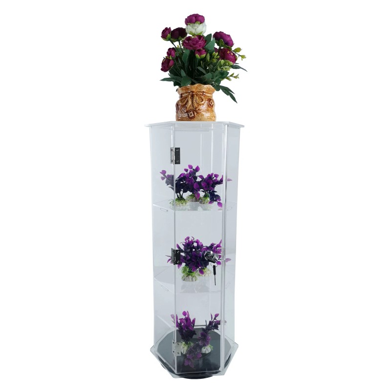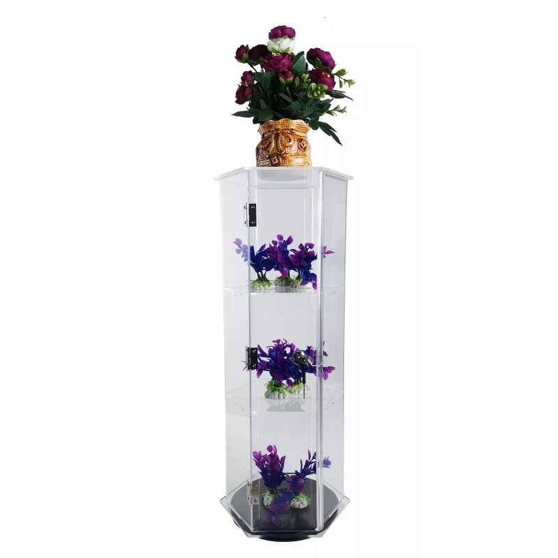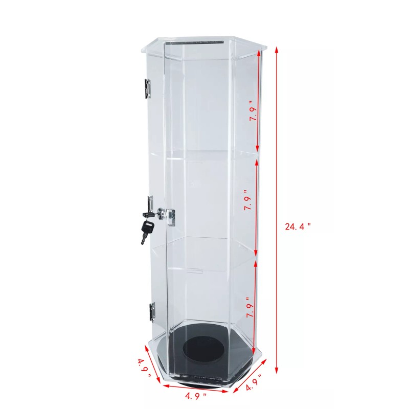 * Measures 9.8*8.5*24.4". Shelf is removable to allow you put taller items inside. This plexilgass display comes with a 8" spinner at bottom. Made from 3/16" (5mm) thick transparent lucite on top and bottom. Body is 1/8" (3mm). This hexagon shaped showcase is 4.5" wide each of the 6 side. See pictures for more measurement details.