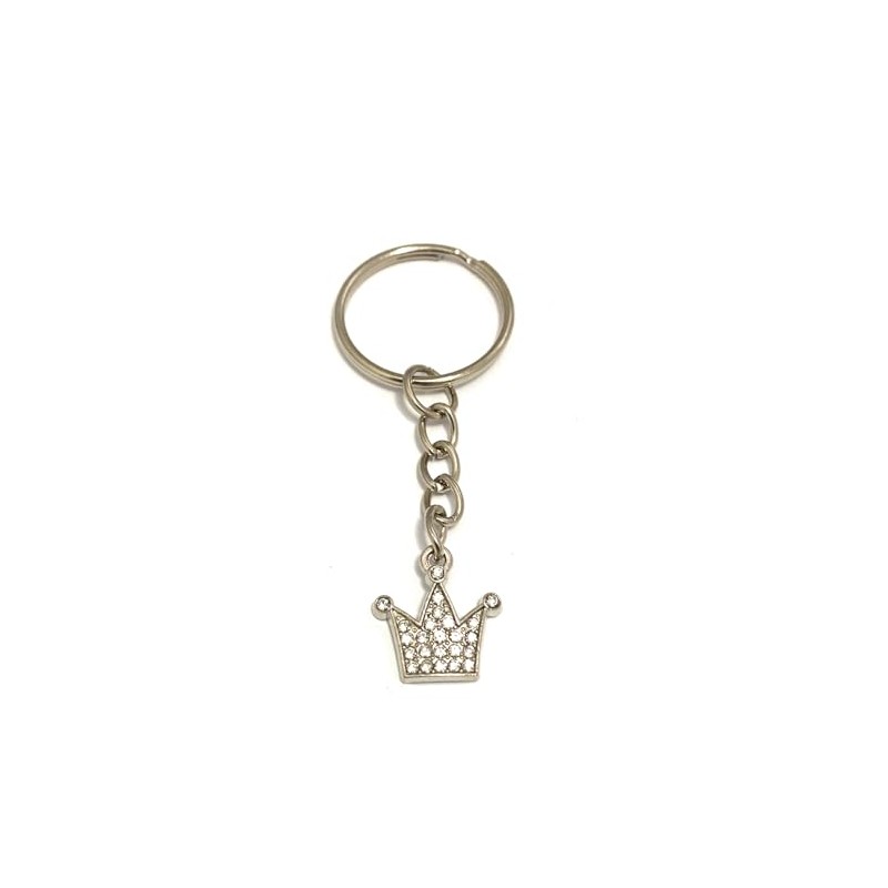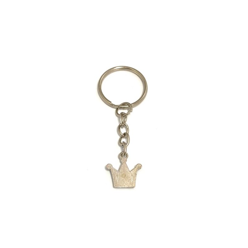 - Small silver tone crown charm with rhinestone detail on one side (15 x 17mm) hung on a silver tone keyring (30mm diameter, chain length 27mm),