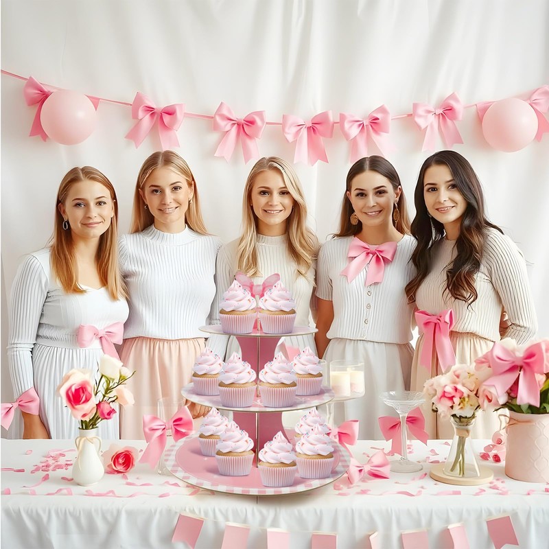 - 5.Ideal Coquette Birthday Decoration: This pink bow cupcake hold can hold enough cupcake, cookies, snacks, desserts, candies, with ample and sturdy height between tiers, it is bow theme birthday party centerpieces for table decorative spotlight