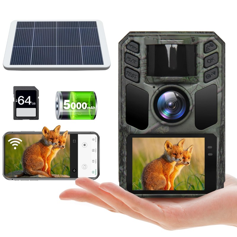 - FKPCAM 2024 Latest Trail Camera, Solar, Infrared Camera, Smartphone Compatible, Wildlife Surveillance Camera, Security Camera, 0.6 Seconds Ultra Fast Trigger, 64 Million Video, 4K, Solar Panel, Includes 2 Rechargeable Batteries, Night Light, Infrared LED, Motion Sensor, IP67 Rated Waterproof, Dustproof, Outdoor, Indoor Camera, Night Vision Camera, Built-in Recording Mic, 64 GB SD Card Included Instruction manual included
