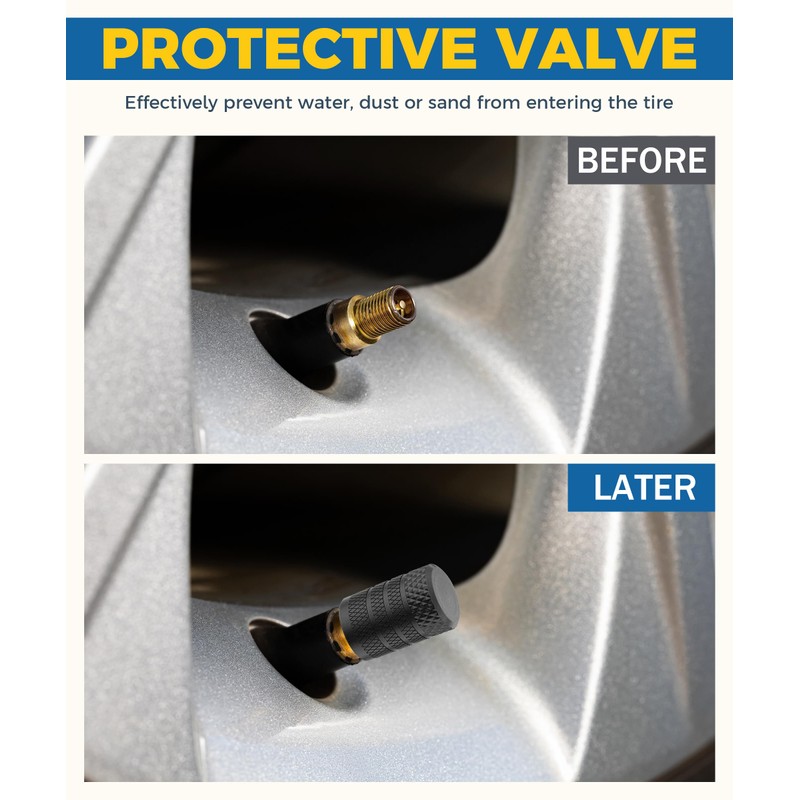 - Main functions: The tyre valve cap can protect the valve core of the tyre, prevent the valve core from coming into contact with soil and water directly and reacting, which accelerates aging, and can prevent leakage of the valve, making your driving safer.
