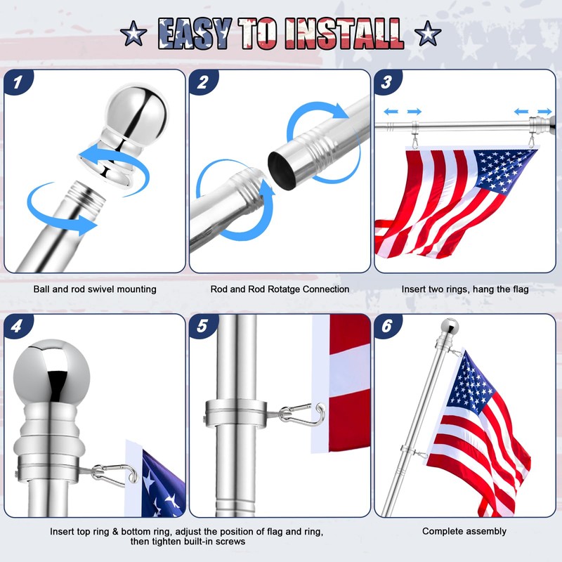 - 【Fit 3x 5' or 4' x 6' Flags】The 6 Ft Metal Flag Pole Kit comes with 5 sections removable and adjustable poles, each pole height is 1.3 ft /40 cm, you can adjust the display pole height freely by reducing the number of pole sections, and 6 feet suits for 3 x 5 Ft / 4 x 6 Ft American flags. The rustproof metal flag pole hardware kit for house can withstand harsh weather elements.