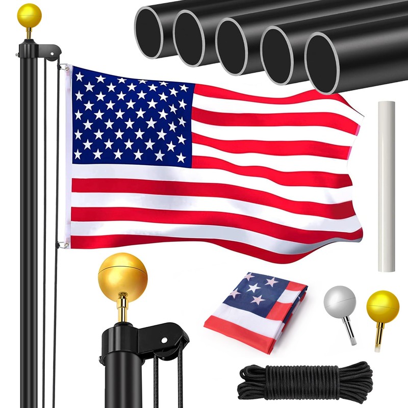 - 🇺🇸[Package Includes]: The 20 ft flag pole kit contains 5 x aluminum poles, 1 x American flag, 1 x top gold ball ornament, 4 x stainless steel clips, 1 x polypropylene rope, 1 x 19.6ft PVC sleeve, etc. We are committed to providing our customers with high-quality products, if you have any questions or concerns, please contact us at any time.