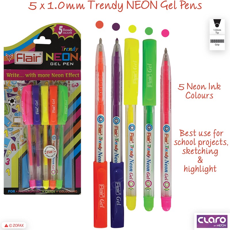 Flair 5 x 1.0mm Trendy NEON Ink Colour Gel Pens Projects Sketching Highlighting