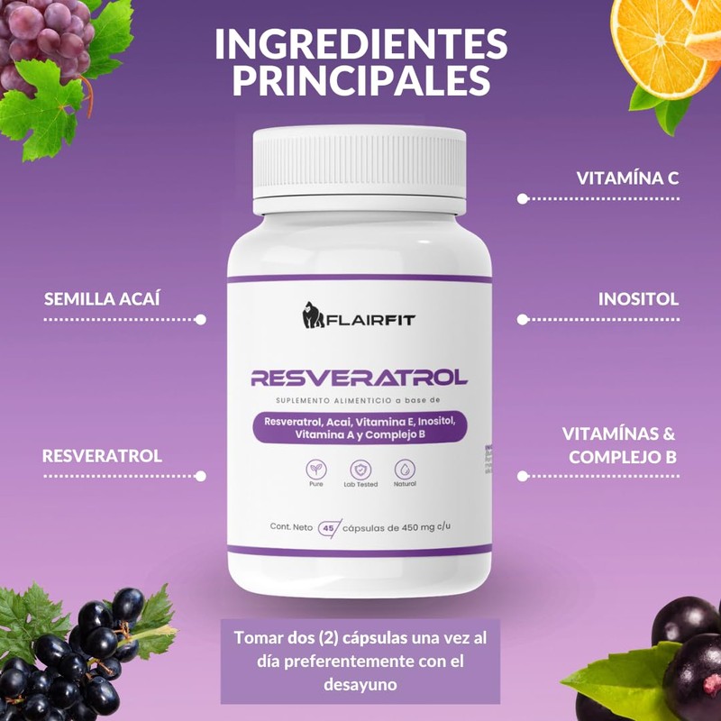 • 🍇 Suplemento alimenticio con 45 cápsulas Flairfit Resveratrol formulado con Pulpa Acai, Vitamína C, Vitamína E, Inositol, Calcio, Complejo B