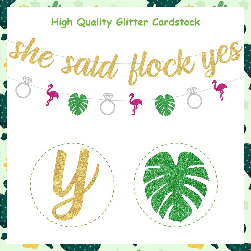 - Wide Application: The she said flock yes banner and flamingo diamond ring palm leaves garland are perfect for tropical hen party, flamingo bridal shower decorations, tropical Hawaiian luau aloha bachelorette party, summer beach pool engagement, wedding supplies, etc.