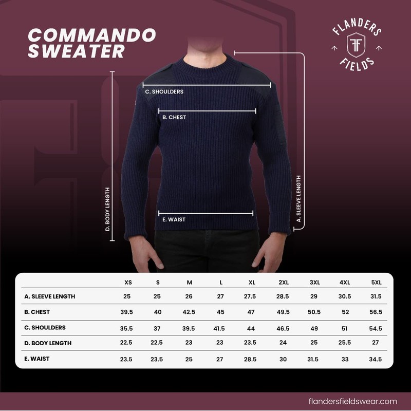Are you looking for a versatile, military wool sweater that fits your rugged, outdoor lifestyle? Whether you're heading out for an adventure or relaxing at a semi-casual event, the Flanders Fields Natural Wool British Commando Sweater brings you the ultimate combination of functionality and vintage style. Inspired by the iconic outerwear worn by the British S.A.S. Commando Regiment and the Royal Air Force Bomber Command, this tactical wool sweater stands out as both durable and stylish. Crafted from 100% natural wool, this wool sweater is designed to provide superior warmth, comfort, and durability. Weighing 26.4 oz (750g), it's the perfect cold-weather companion for outdoor activities like camping, hunting, hiking, or even as daily workwear. The ribbed crewneck sweater features elbow patches, shoulder patches, and stylish epaulets, providing the timeless military aesthetic. Practical and easy to care for, this commando sweater is machine-washable and made to endure the wear and tear of daily use. Available in Olive Green, Navy Blue, and Black, this surplus wool sweater will quickly become your go-to piece for warmth, style, and versatility.