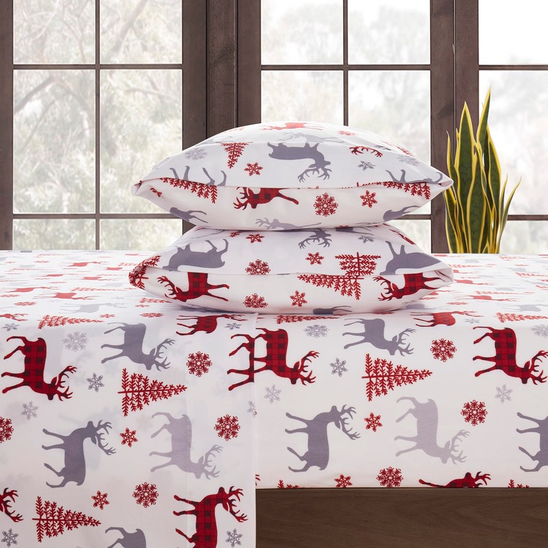 Flannel Sheets Warm and Cozy Deep Pocket Breathable All Season Bedding Set with Fitted, Flat and Pillowcases, Queen, Buffalo Deer
