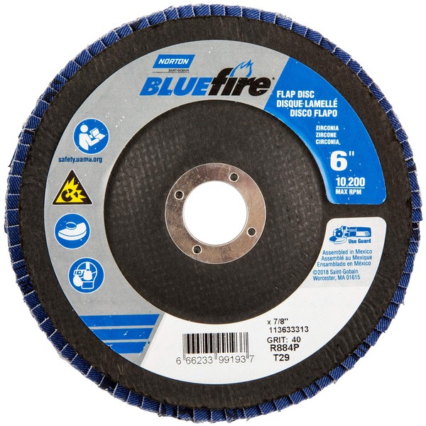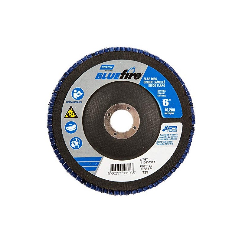 - Price For: Each Backing Weight: Y Series: Bluefire Abrasive Type: Coated Backing Material: Fiberglass Abrasive Material: Zirconia Alumina Item: Flap Disc Disc Type: Type 29 Disc Dia.: 6" Max. RPM: 10, 200 Grit: 40 Grade: Coarse Mounting Size: 7/8" Country of Origin (subject to change): France
