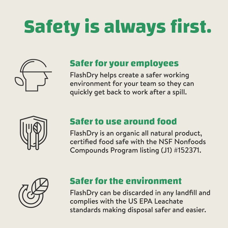 - SAFER FOR PEOPLE: FlashDry is safer for your employees with its dust free andnon-toxic composition. FlashDry helps create a safer working environment for your team so they can quickly get back to work after a spill.