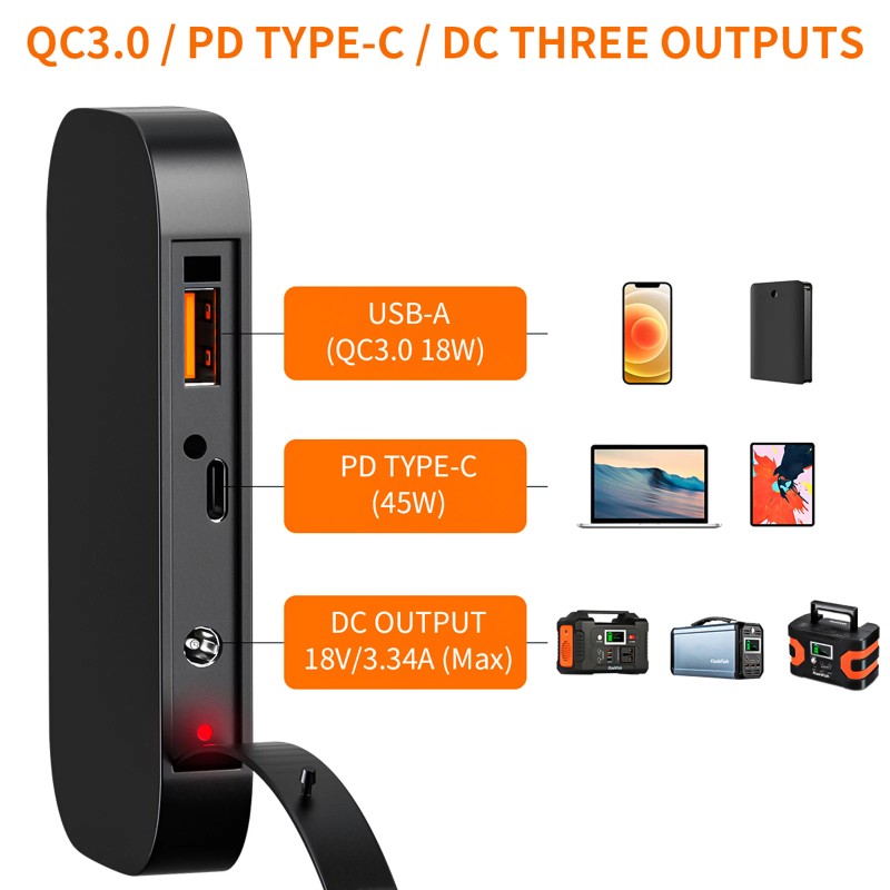 - 2-USB Output Ports: USB-C/QC3.0 Output Port