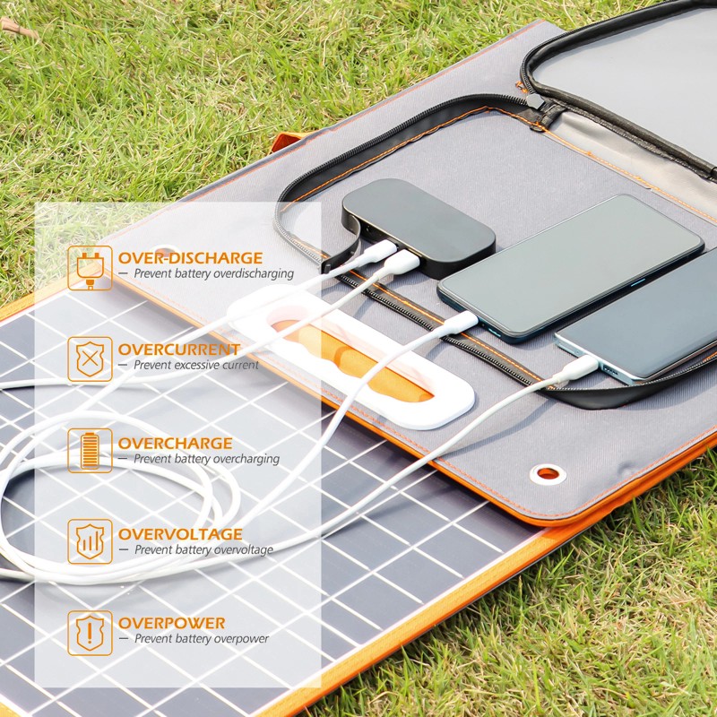 【Foldable & Adjustable Stand Design】Foldable solar charger with handle is portable and lightweight for you to carry, hang and remove easily when you do the outdoor activities. Come with 2 kickstands, adjust the direction of the solar panel to enabling to get the max sunlight.