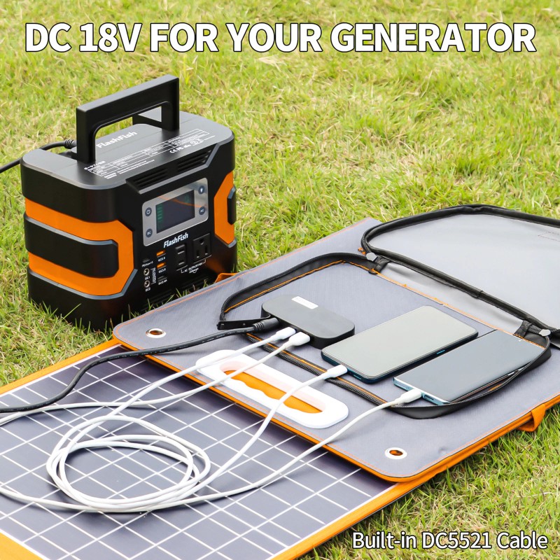 【Wide Compatibility With Most Solar Generators】18V/60W portable solar panel equipped with 3 different size of connectors(8mm/5.5*2.5mm/3.5*1.35mm) and DC Cable(5.5x2.1mm) for charging Flashfish 151Wh/166Wh/222Wh/300Wh. DC output foldable solar panel is also compatible with most portable power station on the market.