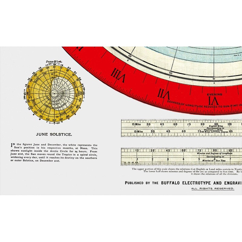 - Map of the globe stretched and flattened into a circular plane. Includes longitude and time calculator and diagrams showing June and December solstices. Border shows "sun-time in minutes."