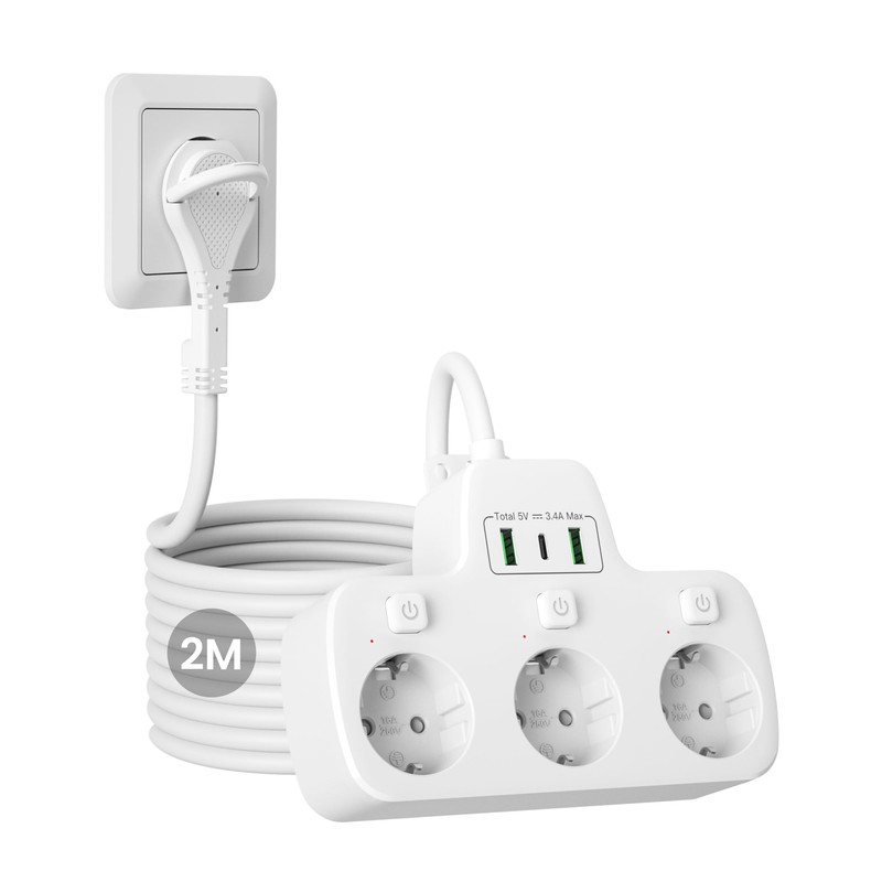 - Power strip 2 metre cable: The power strip comes with a 2 metre power cord, providing great expandability to meet the power needs of different locations. There are 3 holes on the back for hanging the wall. You can attach it firmly to the wall or next to the table with screws. Especially suitable for use in offices, bedrooms and kitchens.
