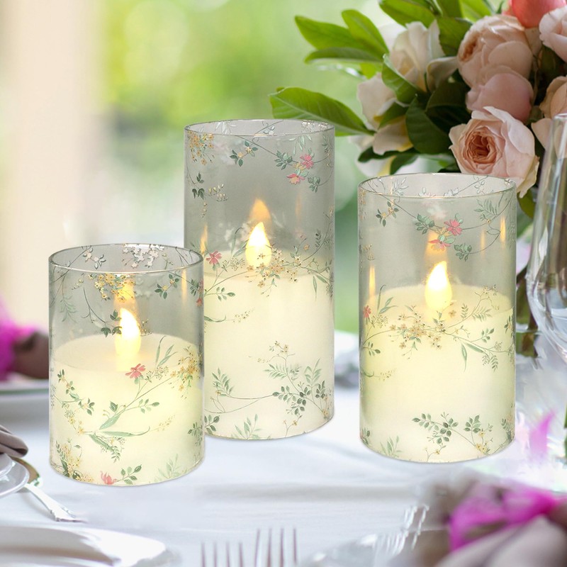 - Elegant Design: Set of 3 flameless led candles made of glass shell with unique green branch and pink flower design stickers surface and real wax bottom. Sizes in 3x4 inch, 3x5 inch, and 3x6 inch. The unique floral branch LED candle is designed to welcome the spring and the summer with lush greenery
