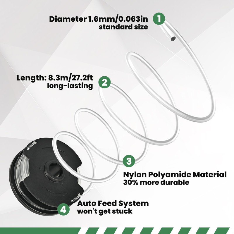 • Efficient weeding: these coils use centrifugal force and aerodynamics to reduce drag and achieve a quick cut. They are pre-wound for maximum reliability and uncompromising performance.