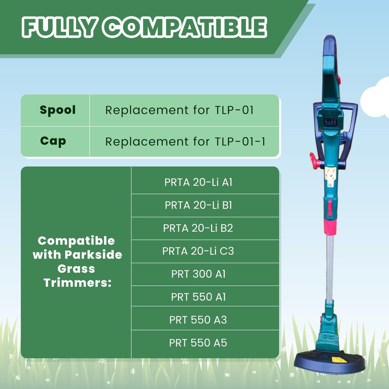 • FULLY COMPATIBLE These spools are compatible with Parkside PRTA 20-Li A1, PRTA 20-Li B1, PRTA 20-Li B2, PRTA 20-Li C3, PRT 300 A1, PRT 550 A1, PRT 550 A3, PRT 550 A5 strimmer. These bobbins are a perfect replacement for the original spool TLP-01.