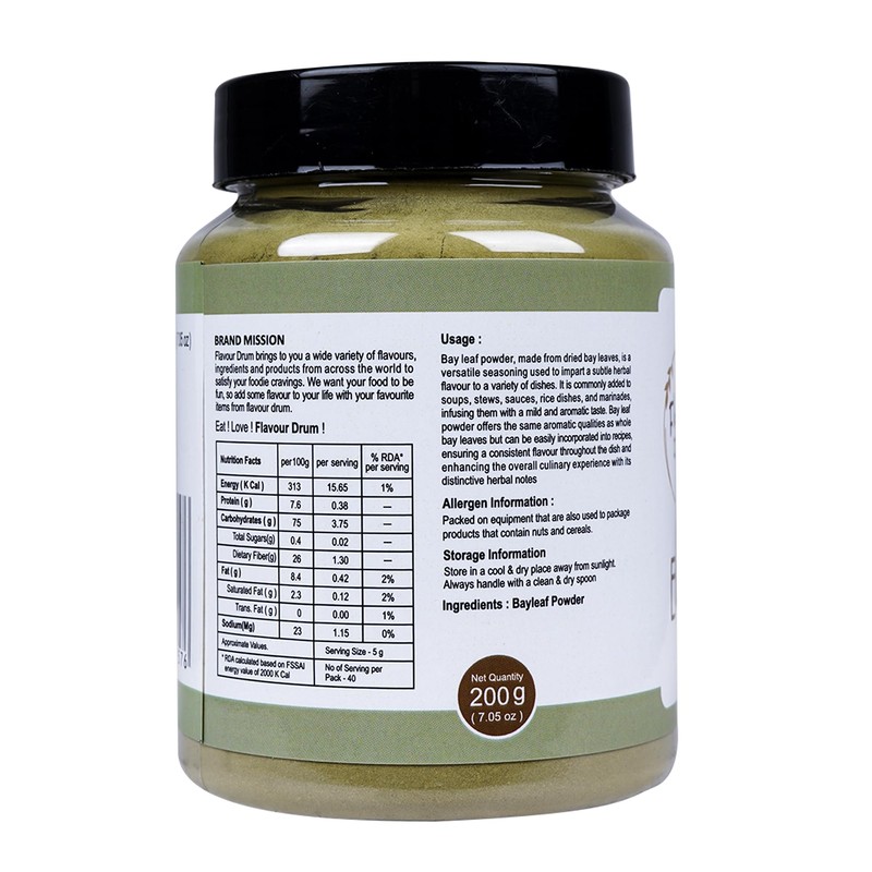 Bay leaves are a rich source of vitamin A, vitamin C, iron, potassium, calcium, and magnesium Bay leaves have been found to have antibacterial properties Bay leaf may help improve skin health Bay Leaf contains enzymes that help to breakdown proteins and digest food faster" Brand : Flavour Drum