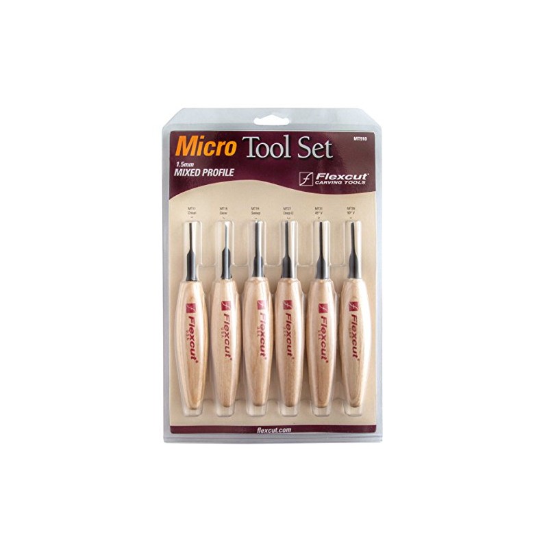 FLEXCUT Carving Tools, 1.5Mm Mixed Profile Micro Tool Set, High-Carbon Steel Blades, with Solid Ash Handle, Set of 6 (MT910)