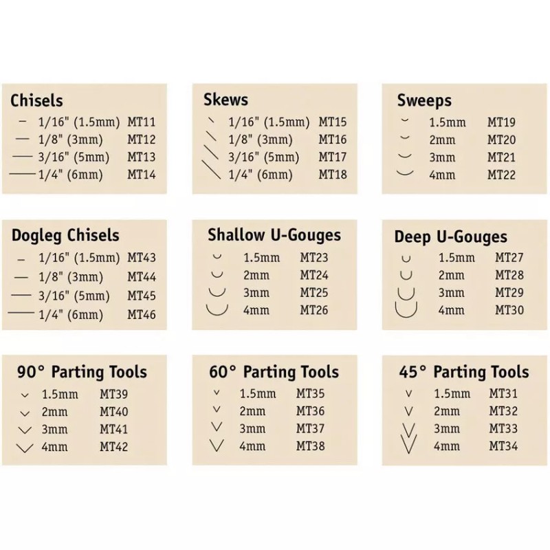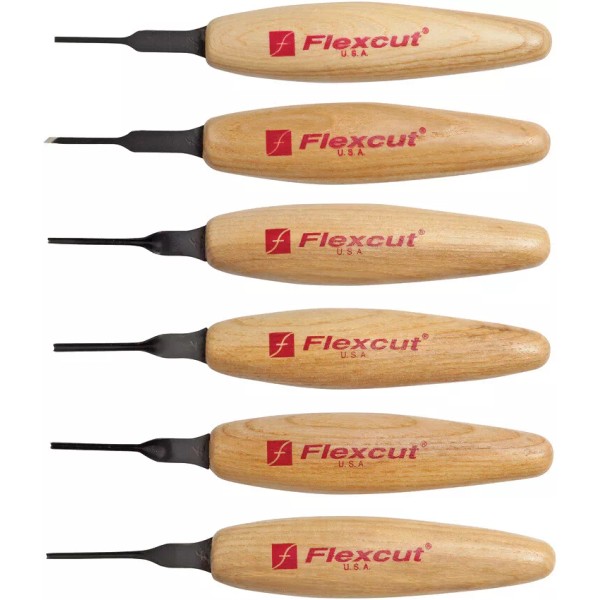 Micro Tool Set. 5.5" overall. 1.75" carbon steel blade. Wood handle. Includes six 1.5mm Profiles: Chisel l (FLEXMT11), Skew (FLEXMT15), l Sweep, Deep-U, 45 V and 90 V. These tools are designed to handle extra-fine details such as fur and feathers. Hang packaged. -