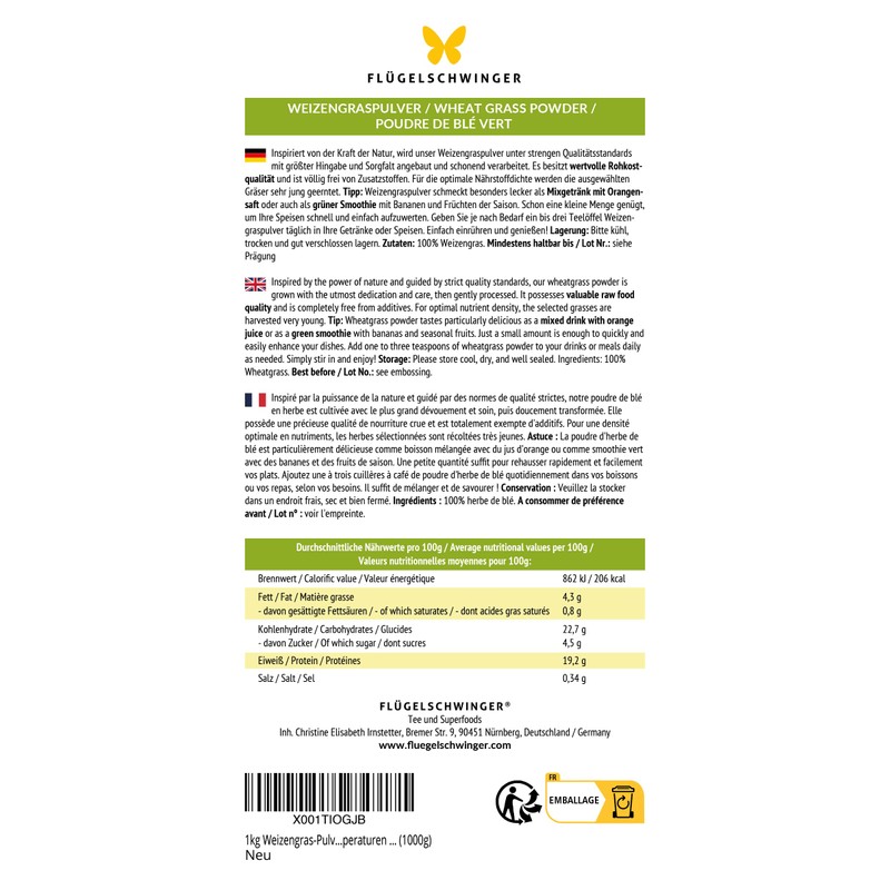 Flgelschwinger 1kg Weizengras-Pulver von FLGELSCHWINGER aus jungen Gr?sern, ohne Zus?tze, Rohkostqualit?t, schonende Verarbeitung bei niedrigen Temperaturen (1000g)
