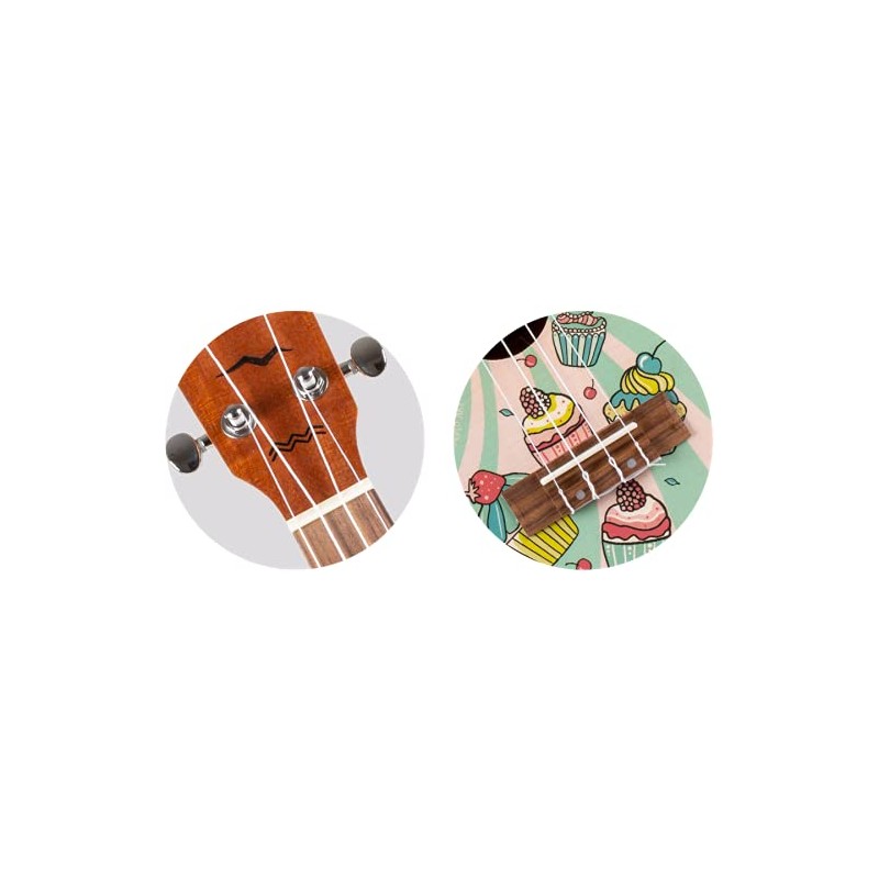 - At its heart, the AUC-33 Cupcake is an excellent ukulele with a laminate spruce top and laminate mahogany back and sides, but it features a design twist: it features amazing artwork on the soundboard. There have been no shortcuts taken with the design of these instruments–they sound and play as good as they look.