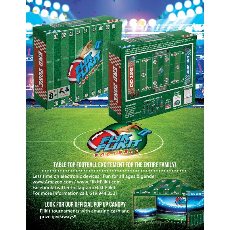 FlikIt FlikIt Football Table Top Board Game For Kids Ages 8+, 2 Players FlikIt FlikIt Football is a unique 6 fold tabletop board game. Each player takes turns attempting to flick the ball into the opponents' end zone for 7 points or land on a 3pt attempt to try a field goal. Score as many touchdowns and field goals before time expires. FlikIt FlikIt Football offers hours of fun and entertainment at parties, tailgates, and other social events. Take the family away from electronic devices and around the table for pure competitive fun!! FlikIt is great for children ages starting at 8+