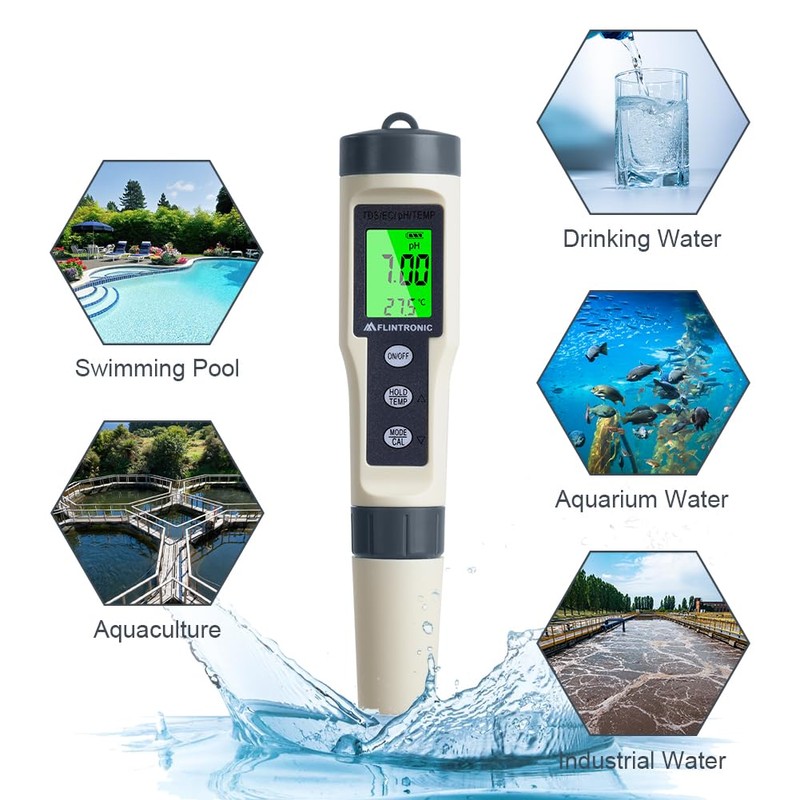 - Versatile: this 4-in-1 multifunctional pH tester is ideal for pH tests at home and in the laboratory. It can be used to test the quality of drinking water, swimming pools, aquariums, hot springs, aquacultures, ponds and well water in the home or on holiday to ensure water safety in everyday life. If you have a problem with the product, please do not hesitate to contact us! Flintronic PH Meter 4-in-1 PH/TDS/EC/Temperature Water Quality Tester