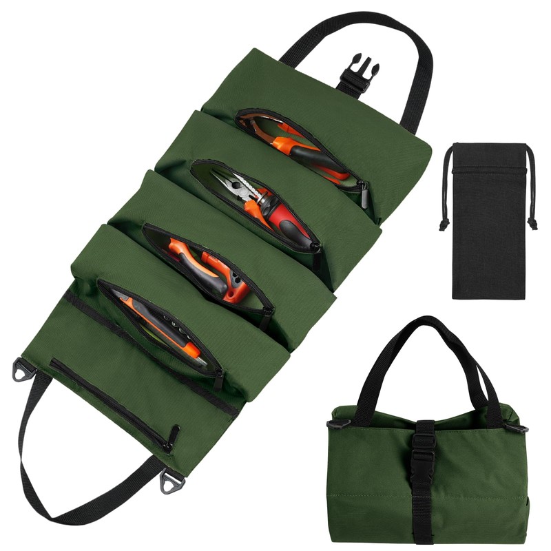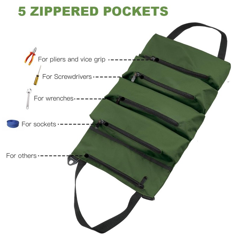 Flintronic Portable Storage Bag flintronic Tool Roll Bag, Wrench Tool Bag, Multi-Purpose Roll Bag with 5 Zip Pockets, Multifunctional Roll Bag (Green)