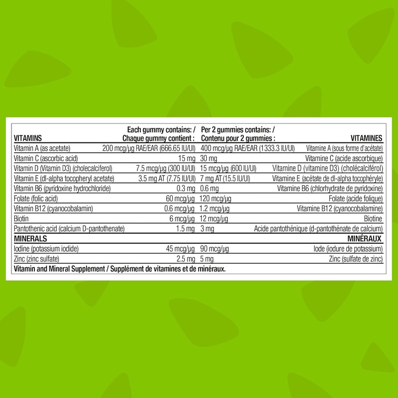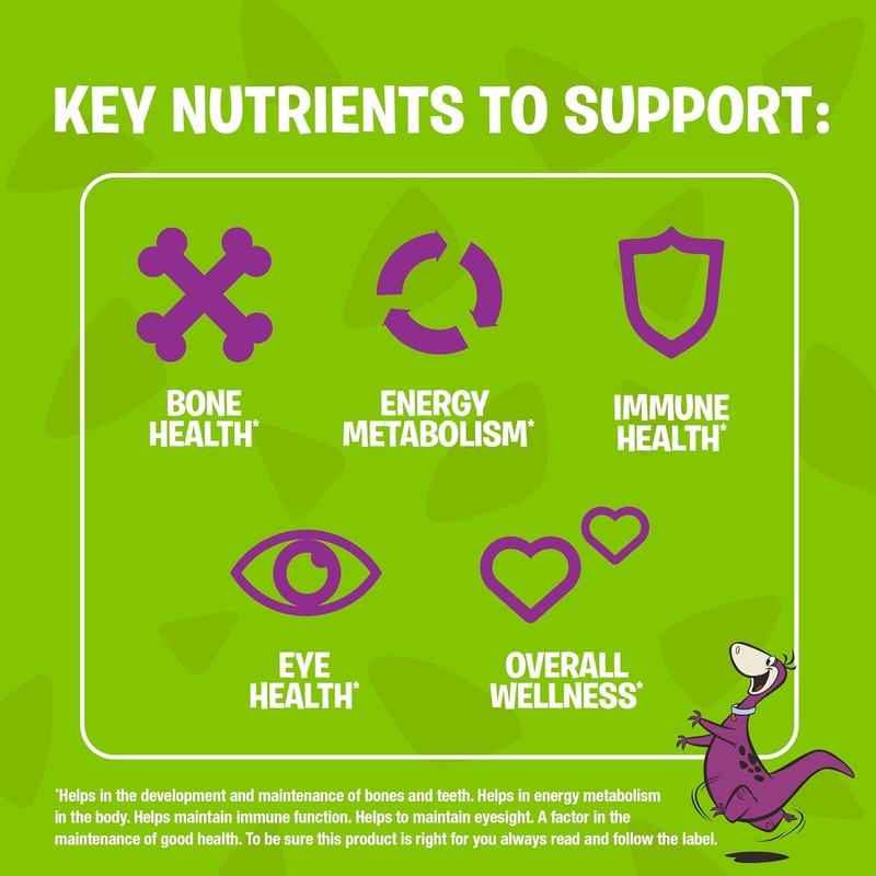 • Key Essential Nutrients from Vitamins and Minerals: Kids Gummy Multivitamins with Vitamin A, Vitamin B6, Vitamin B12, Vitamin C, Vitamin D, Vitamin E, Folate, Biotin, Iodine, Pantothenic Acid, and Zinc to help provide your child nutritional support outside of their regular diet.