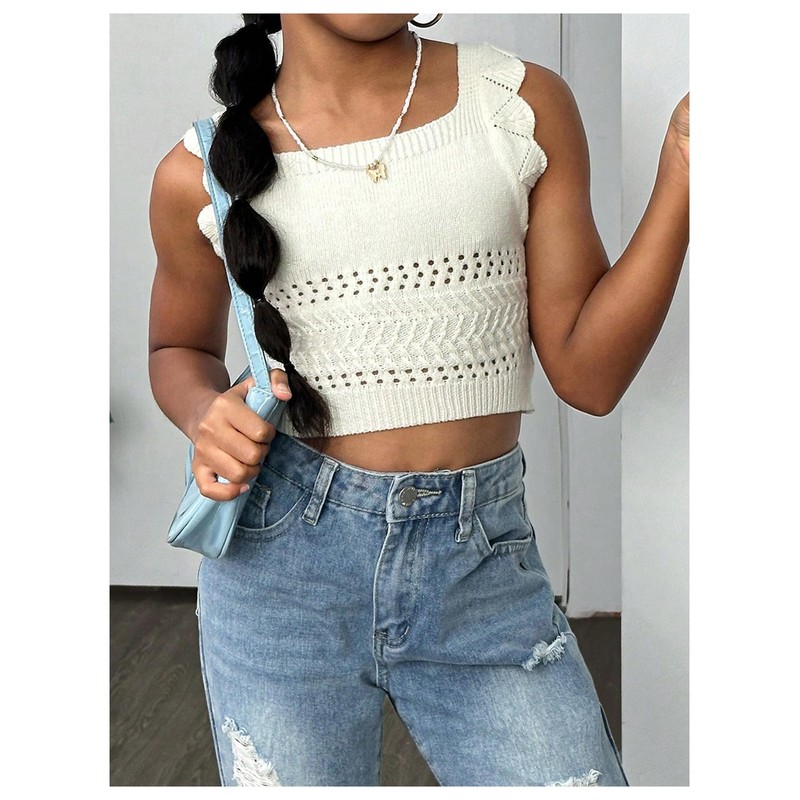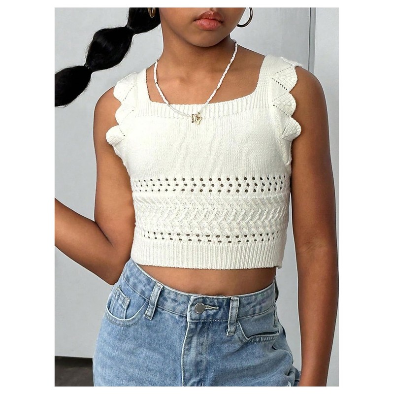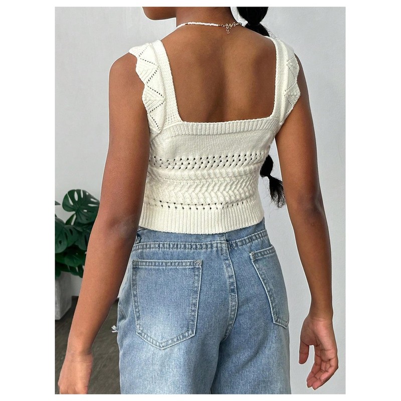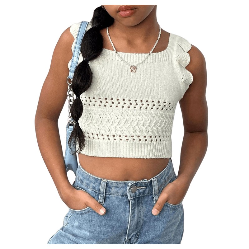 - Feature: Sleeveless, square neck, crochet knit, ruffle trim, hollow out, sweater pullover