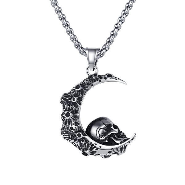 Flongo Gothic & Vintage Unisex Stainless Steel Moon Skull Pendant Wheat Chain Necklace 56cm Punk Hip Hop Rock Men Women, Stainless Steel, Moon