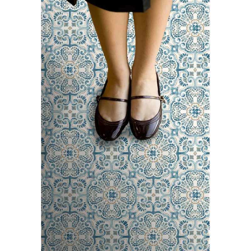 Add a splash of color and intrigue to your floors with these peel and stick tiles. The blue, tan, and white Moroccan-inspired design looks hand painted. Fontaine Peel & Stick Floor Tiles contains 10 pieces on 10 sheets that each measure 12 x 12 inches. This product measures 60-in x 24-in x .06-in when assembled.