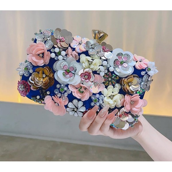 Floral Clutch Purse for Women Silk Glitter Evening Handbag Ladies Dress Crossbody Bags for Wedding,Prom,Party, Blue, Medium