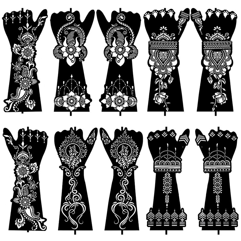 - COMPREHENSIVE PACKAGE - Our henna stencil set includes 10 sheets (5 pairs), with each pair consisting of left and right designs, allowing for symmetrical application on both hands. Whether you're crafting elaborate hand designs or intricate forearm patterns, our versatile stencils provide the perfect canvas for your artistic expression.