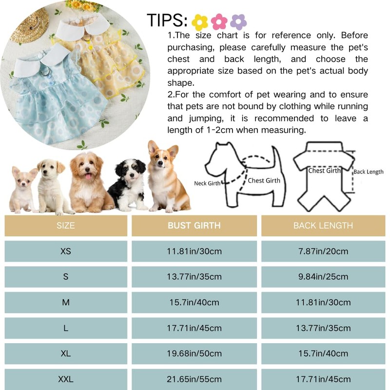 - Size Chart: Pet skirt is suitable for most small dogs, please measure your dog's bust, neck, back size before buying, please use a tape measure and leave 2 finger width between the dog's neck circumference, to make sure your dog doesn't feel tight.