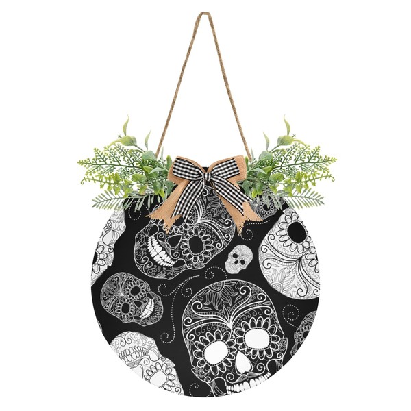 Floral Sugar Skull Day of The Dead Seamless Black White Door Hanging Sign, 12" Merry Christmas Front Plaque Board Round Wreath for Daily Holiday Welcome Home Garden Yard Wall Pediments