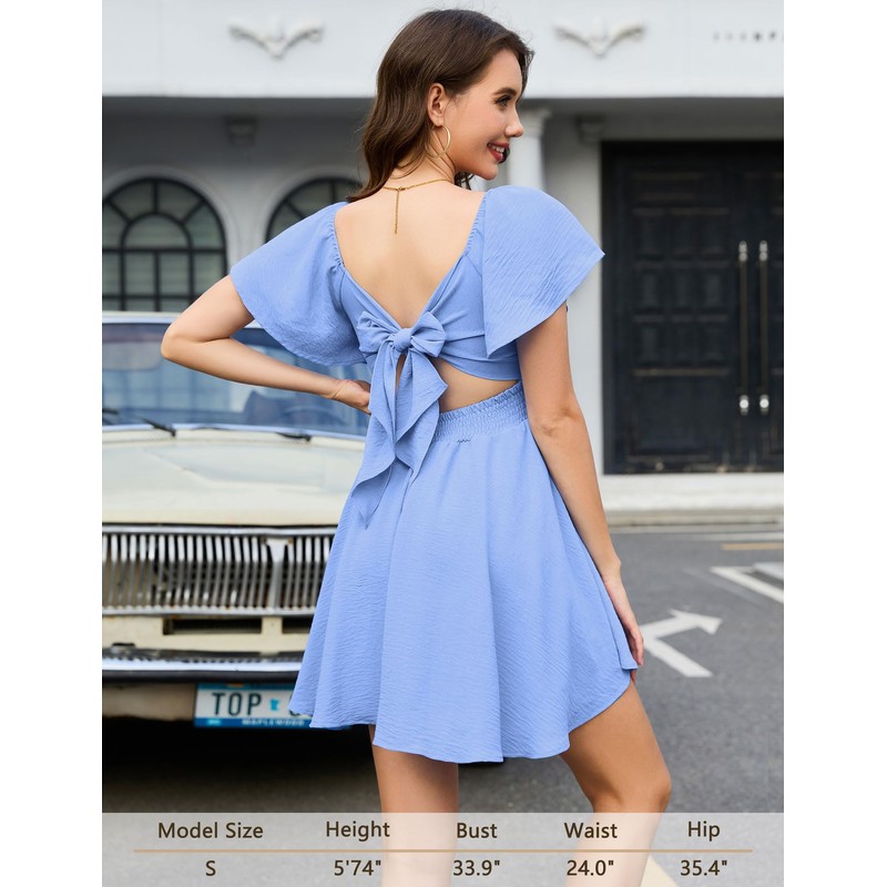 Florboom Women's Square Neck Flowy Sexy Dress Short Sleeve Tie Backless Cute Casual Swing Mini Dresses, 2025 Summer (Blue, M)