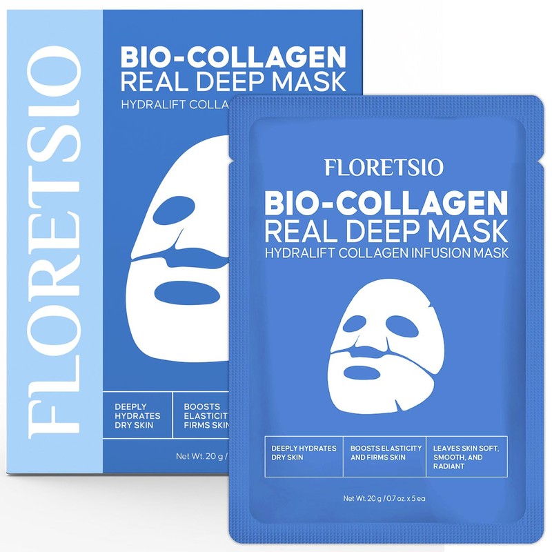 Floretsio Bio-Collagen Real Deep Mask: Anti Aging Face Masks Overnight - Pore Minimizer, Glow, Hydrating, Tightening - Hydrogel Sheet, Hyaluronic Acid, Women Skincare, 5 pack