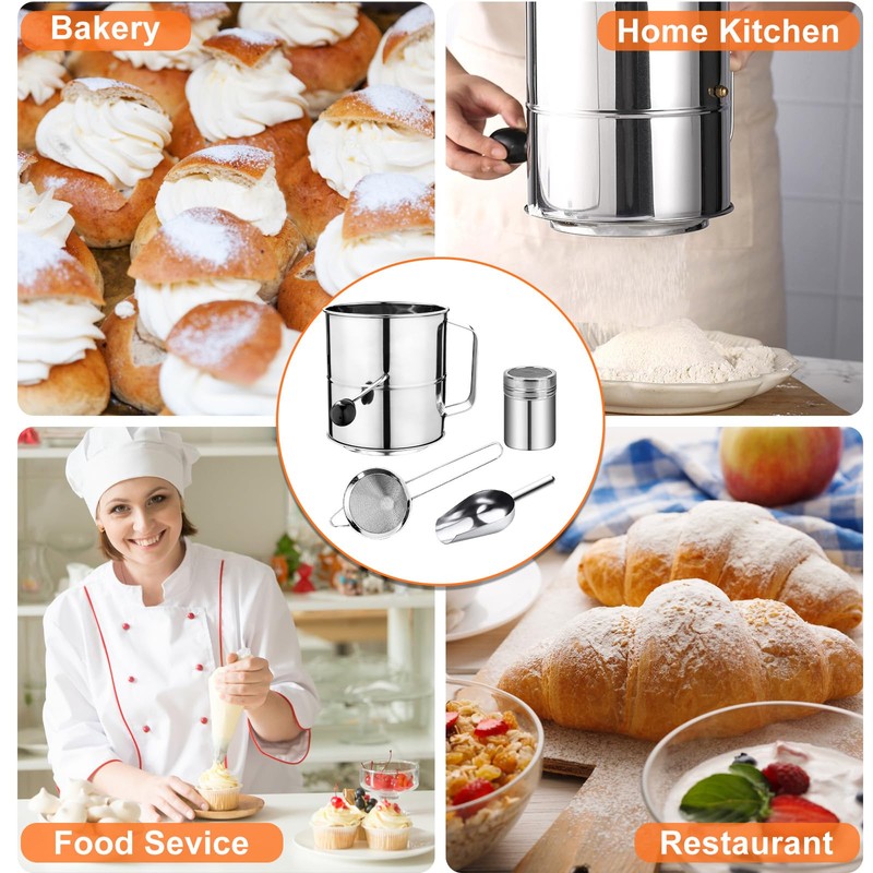 Flour Sifter,8 Cup Stainless Steel Flour Sifter,4 in 1 Baking Sifter Set with Powder Sugar Shaker Duster,Strainers Fine Mesh and Metal Scoop for Baking Cakes,Pastries,Pies,Cupcakes,Desserts