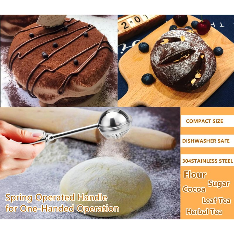 • UNIQUE DESIGN-The flour duster has a solid side for scooping powdered sugar, and the fine holes on the other side are for sprinkling powdered sugar. Spring-operated Handle flour duster for accurately and quickly screen flour, sugar powder, spices, etc. Reject kitchen clutter.