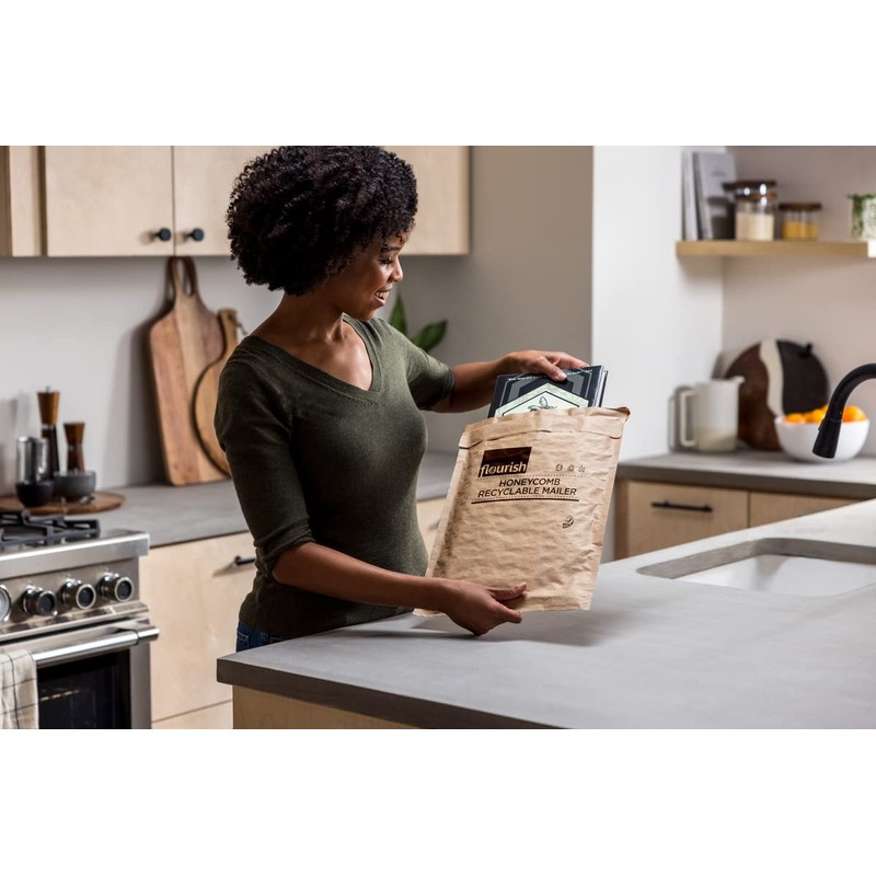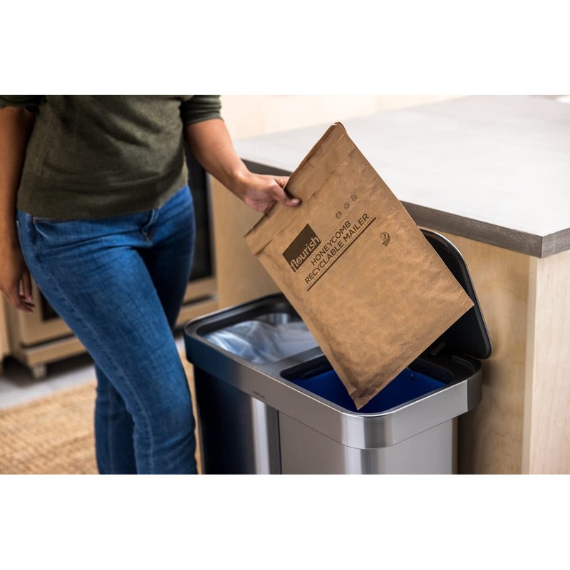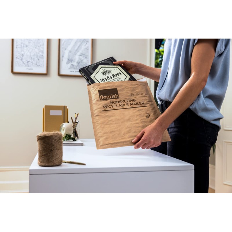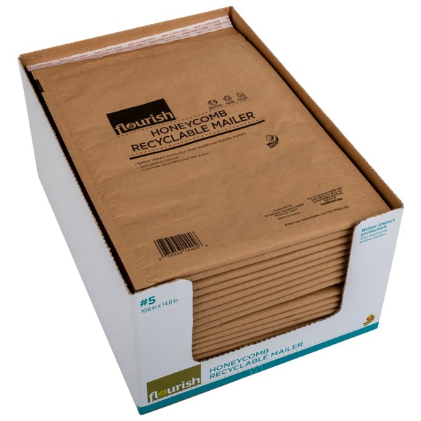Flourish Brand Honeycomb Recyclable Mailers are the perfect solution to keep items safe during mailing or shipping in an environmentally responsible way. These 100% recyclable mailers can be recycled just like a box after use for a more sustainable mailing solution. Plus, they are made with 10% recycled content and offer greater impact protection than standard bubble mailers for superior protection. The die cut honeycomb layer creates loft and cushioning that protects items during shipment, while the double-layer seal top flap reduces tearing. The high-strength folded bottom ensures the mailer will stay closed throughout the shipping process.