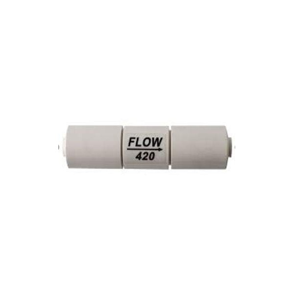 Inline 420 cc/min flow restrictor with 1/4" quick connect fittings, for use with 50 GPD reverse osmosis systems. Installed inline on the RO system brine (drain) tubing to create membrane back pressure and force water through the RO membrane. The flow restrictor should be replaced each time the reverse osmosis membrane is replaced.