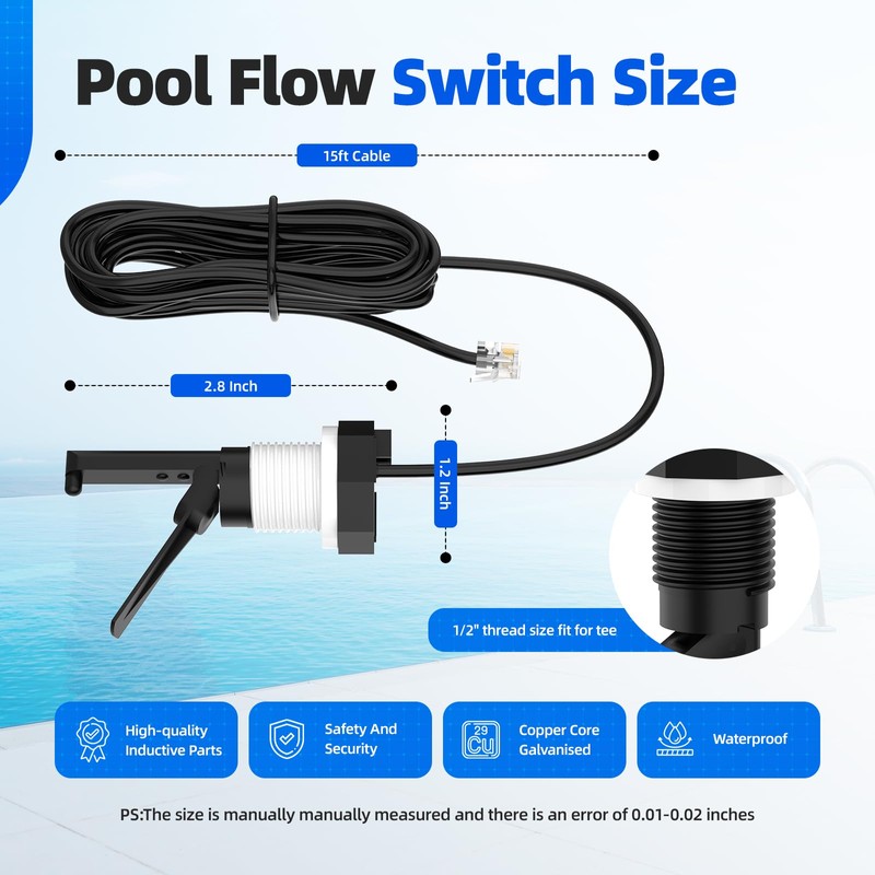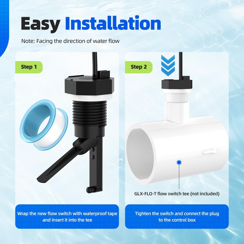 • Easy Installation: The GLX-FLO-RP flow switch uses standard 1/2'' threads, simply screw the pool flow switch into the tee pipe with enough tape and then easily plug the standard phone plug into the control panel of your pool chlorination system to complete the installation, this quick and easy process will turn off the “no flow” in minutes! Warning Light
