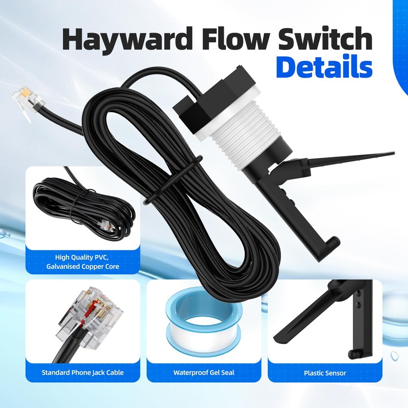 • Product Information: GLX-FLO-RP hayward flow switch assembly, suitable for Hayward Goldline and Aqua Salt systems,sensing piece is made of high quality plastics for longer service life,15ft Cable,comes with waterproof tape