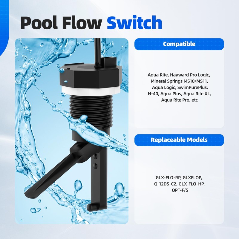 • Compatible Models:This pool flow switch is compatible with Hayward salt chlorine generator systems including Aqua Rite, Hayward Pro Logic, Mineral Springs MS10/MS11, Aqua Logic, SwimPurePlus, H-40, Aqua Plus, Aqua Rite XL, Aqua Rite Pro, etc, Replaceable models: GLX-FLO-RP, GLXFLOP, Q-12DS-C2, GLX-FLO-HP, OPT-F/S