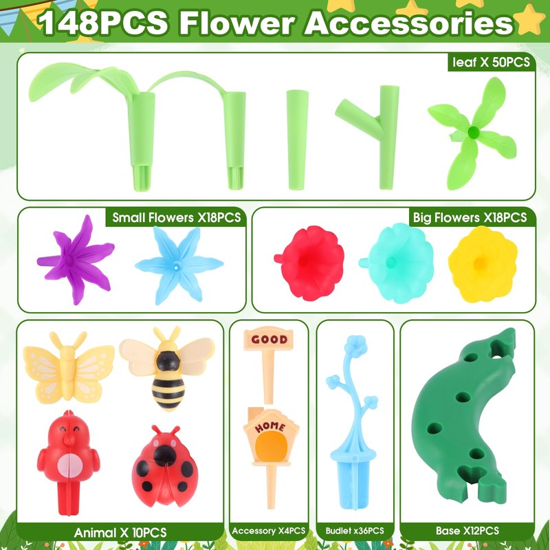 - 148 PCS Blocks Set:This set comes with 36 flower pieces, 50 stems and leaves, 36 stamens, 12 green bases, 10 animal, 4 accessory. All parts are interchangeable and can be infinitely combined and designed.
