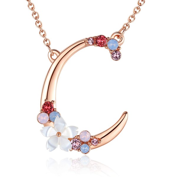 Flower Initial Letter Necklace, Pink Red Blue Simulated Pearl Pendant Name Jewelry Made with Austrian Crystals Rose Gold Plated Anniversary Birthday Gifts for Women,18"+2" (C)